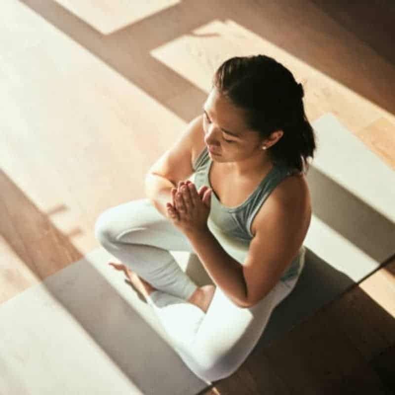 Woman practicing mindfulness meditation in seated prayer pose, representing the CPD-accredited Meditation, Mindfulness & Breathwork for Coaches self-study course.